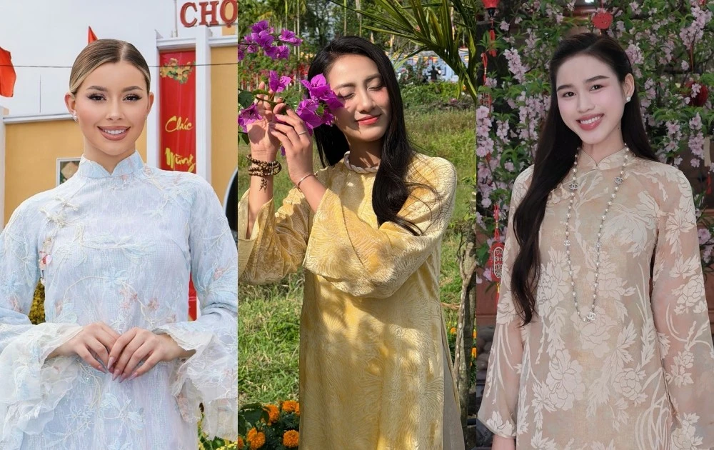 Hoa hậu Việt Nam 2014 – Miss Universe Vietnam 2024 Nguyễn Cao Kỳ Duyên và Miss Grand Vietrnam 2022 mặc áo dài đôi đón năm mới.