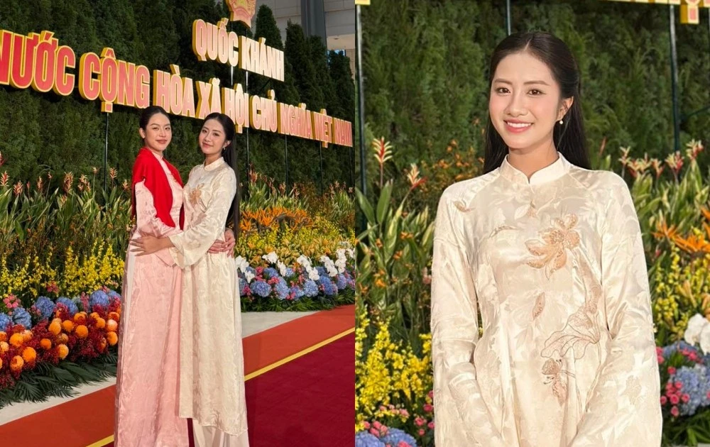Hoa hậu Việt Nam 2024 Hà Trúc Linh cũng vinh dự có mặt tại bữa tiệc. Nàng hậu mặc áo dài nền nã, tự hào khi có cơ hội được tham gia sự kiện cấp Nhà nước.